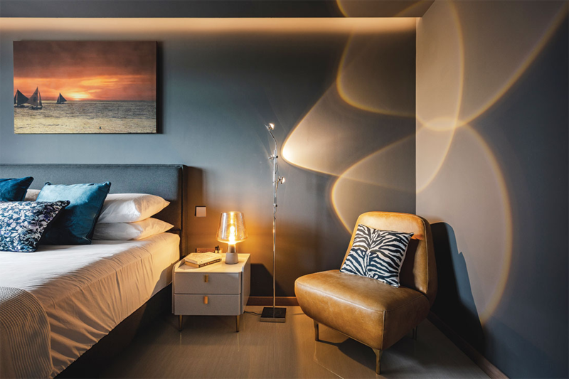 • Акцентный свет – LED-лента за изголовьем, подсветка текстурных стен.